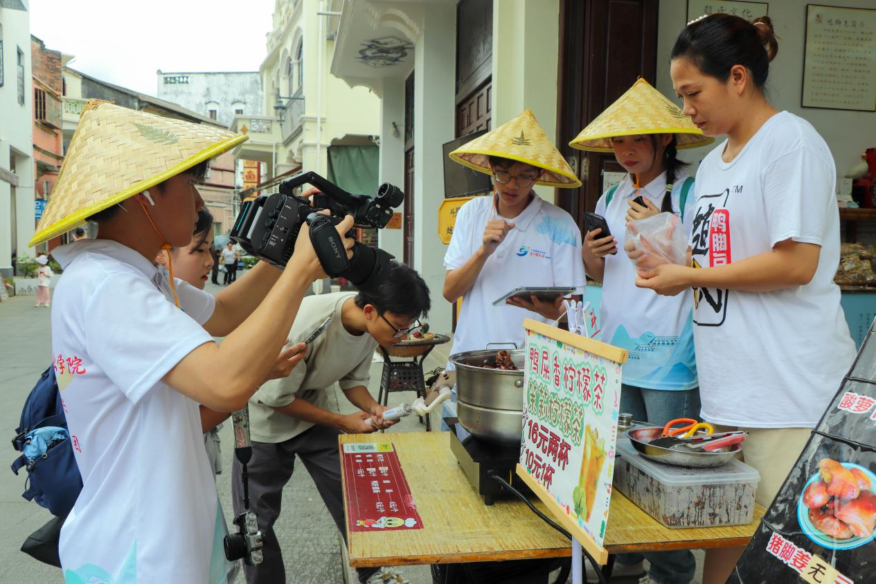 实践团视频组成员化作乡村新“媒”人,运镜连拍为斗门非遗“绘新妆”,从自然、历史、人文和建筑等多个角度寻觅创作灵感,乡道村落寻“古”、深入挖掘汲新知,街巷阡陌寻“味”、活态传承展新姿,通过人物访谈和实地调研深入挖掘了和谐乡风和传统文化,用镜头记录了南门村的独特人文建筑、非遗文化和村容村貌,并努力以创新渠道激活珠海斗门赵氏文化生命力。团队成员以南门村村口牌坊为起点,用镜头沿途记录历史壁画墙绘、菉猗堂、毓秀书房等标志性景点及赵家擂茶铺、益和楼等百年老字号美食店,进一步唤起游客对斗门美食的探索欲望,彰显斗门非遗美食的独特魅力。在此基础上,团队成员以“讲村史、展村史、传村史”为主题精心制作了美丽乡村文旅短片,详细介绍斗门南门村著名景点——菉猗堂,深入阐述了菉猗堂建筑特色及背后蕴藏的历史故事,以生动的影像和详细的讲解展示了南门村的独特风貌和赵氏文化悠久的历史积淀。实践团通过线上媒体多终端传播、线下多感官真实体验等“融媒体+非遗”模式,进一步推动斗门文旅产业经济蓬勃发展,为斗门乡村经济增长和乡村振兴贡献青年力量。